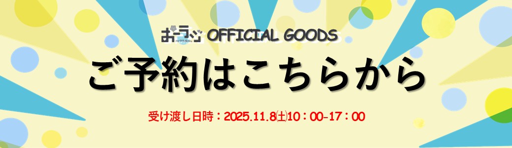 上記フォームでは、事前にご予約いただくことができます。当日は受付にて、ご予約のお名前をお申し出いただくことで、現金と引き換えでご予約いただいたおーラジグッズをお渡しいたします。ご予約条件は以下をご確認ください。